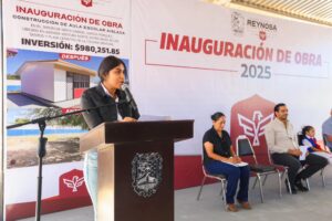 La Maestra Vilma Patricia Martínez Tavares, Encargada del jardín de niños Gabriel García Márquez, recibió al Presidente Municipal Carlos Peña Ortiz, «hoy es un día muy especial para nuestra comunidad escolar ya que celebramos la entrega de una nueva Aula, que representa crecimiento, oportunidad y esperanza para nuestros alumnos».